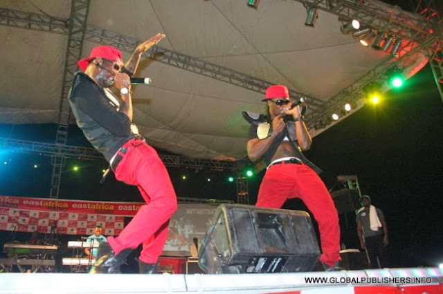 Peter na Paul Okoye wa kundi la P-Square wakilivamia jukwaa la Leaders